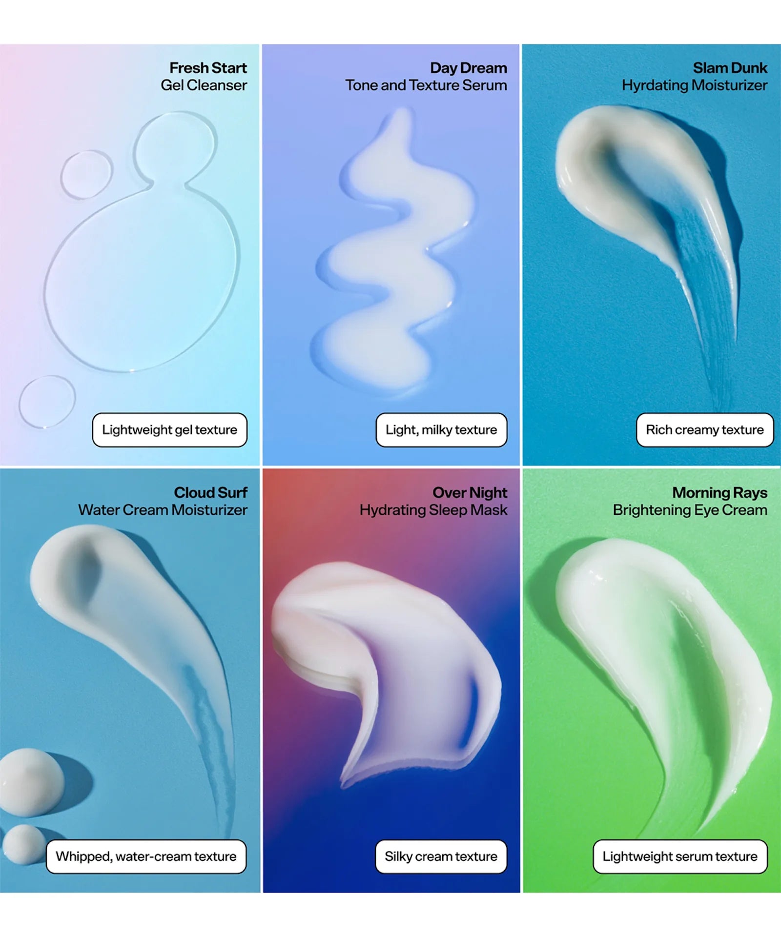 - Cloud Surf (10ml): Expect lightweight moisture with this cream that helps reduce the visibility of pores, rebalance oil levels, and nourish the skin with a hibiscus extract, celery seed extract, and lilac extract-infused formula.