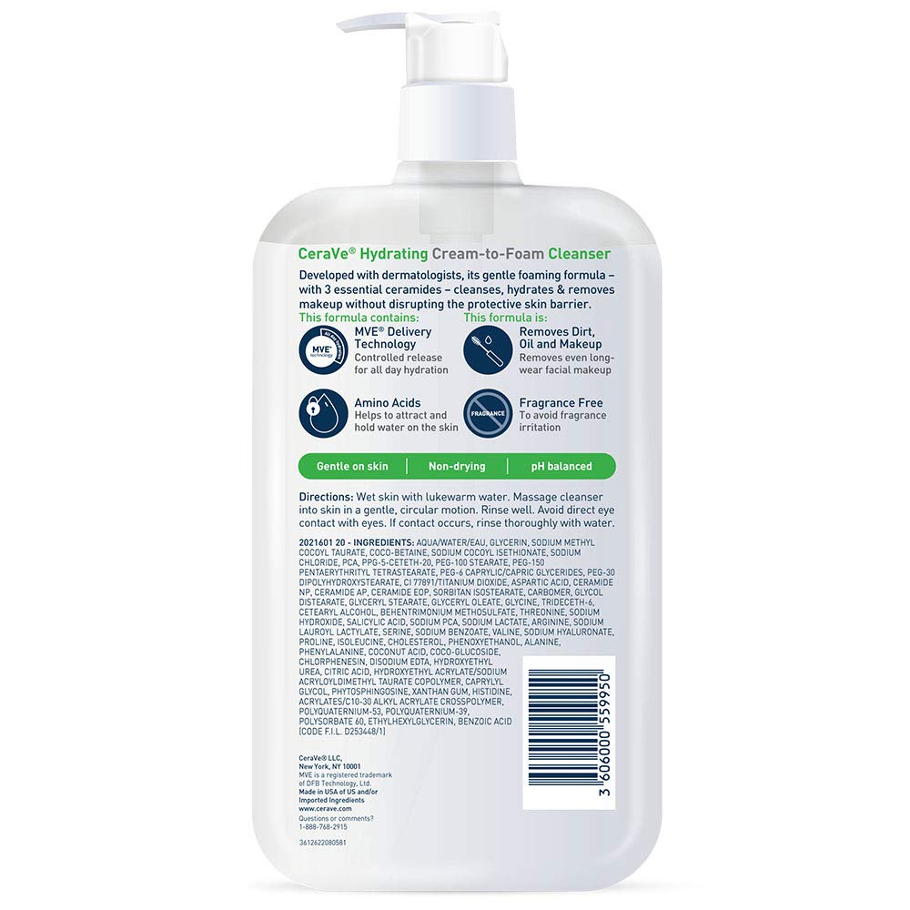 Developed with dermatologists, CeraVe Hydrating Cream-to-Foam Facial Cleanser has a unique one-step cleansing formula with three essential ceramides (1, 3, 6-II) that gently cleanses, thoroughly removes oil and makeup, and hydrates the skin barrier. This creamy foaming face wash begins as a cream before transforming to a soft foam when you begin to lather it on the skin with water.