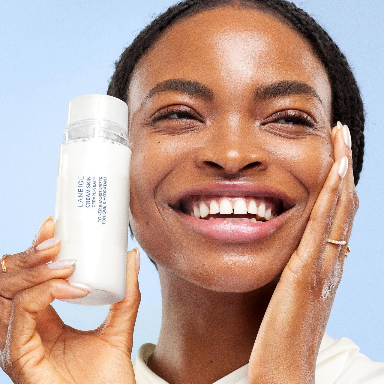 A comforting milky cream and toner hybrid in a refillable bottle, enriched with nourishing ceramides and peptides for radiant, hydrated skin.