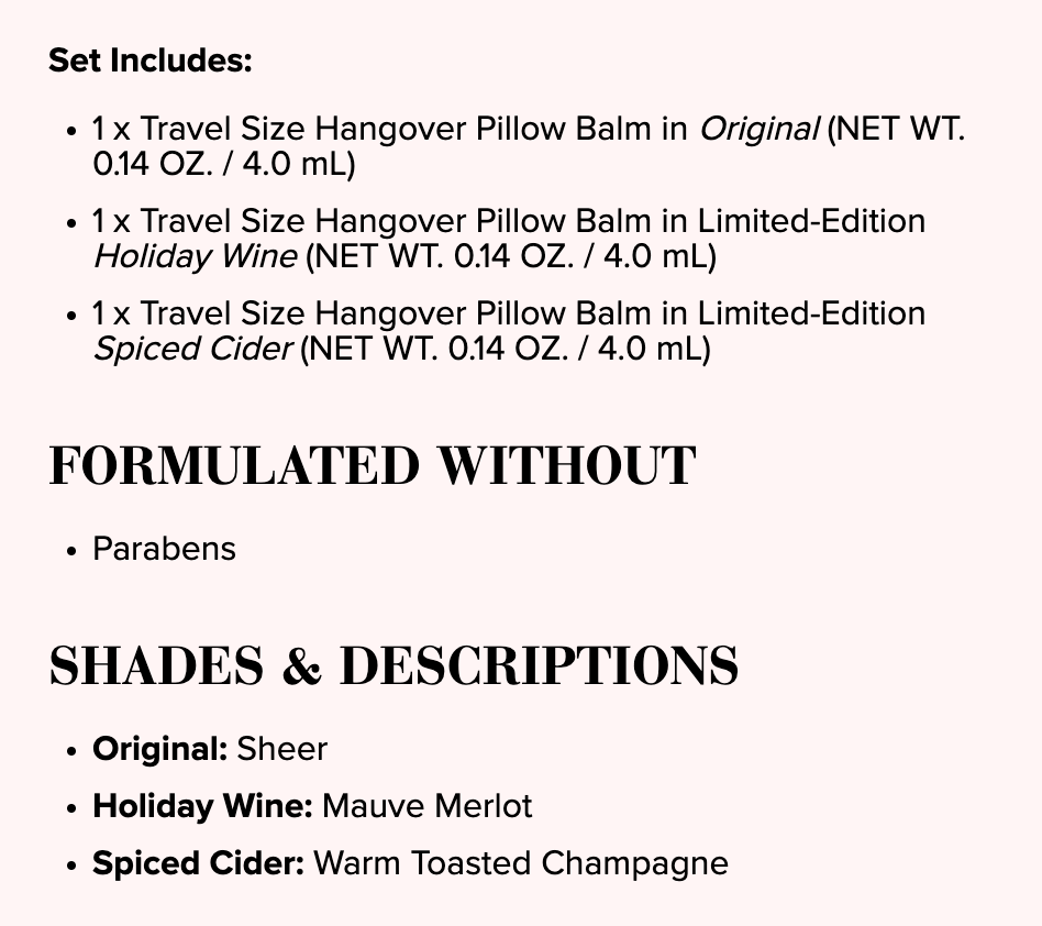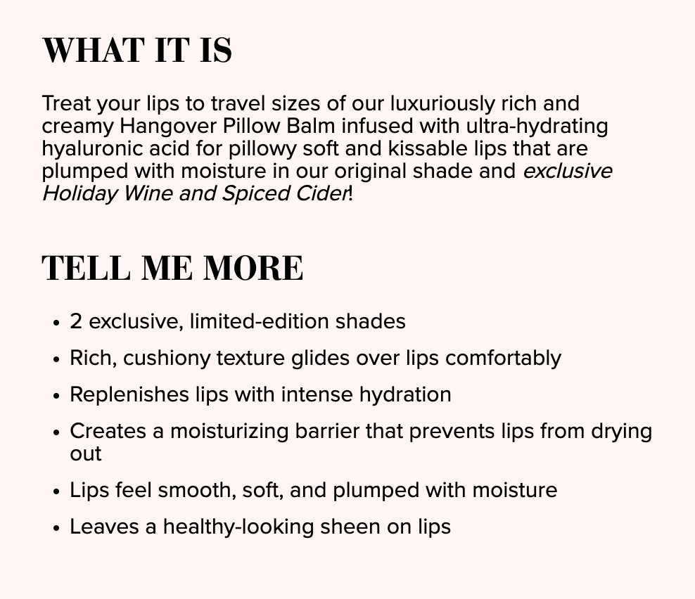 A must-try from Too Faced's newly extended Hangover collection, the Pillow Balm Nourishing Lip Treatment replenishes moisture and smooths chapped lips. And this Warm & Spicy Set means you get three for one, happy holidays!