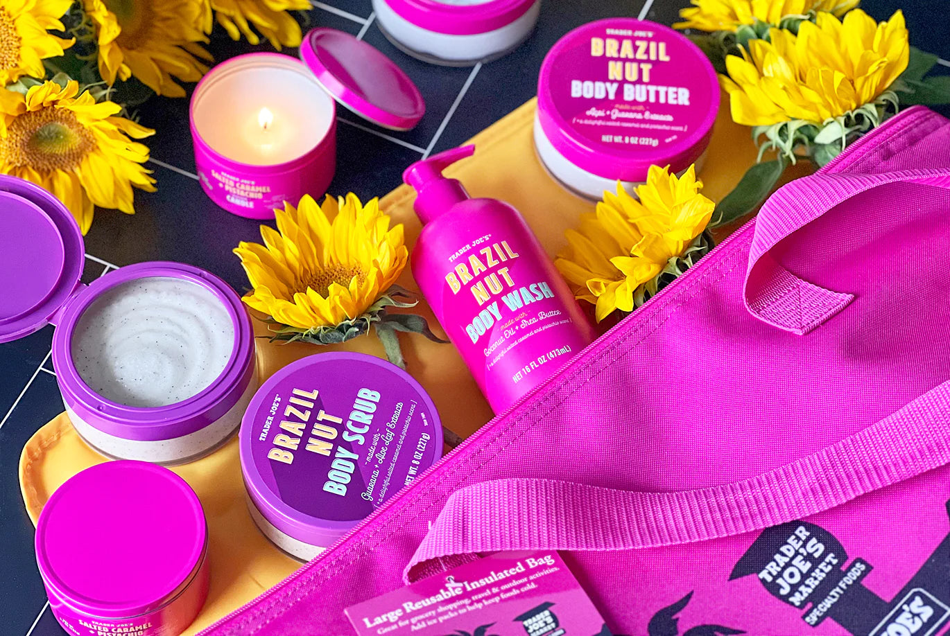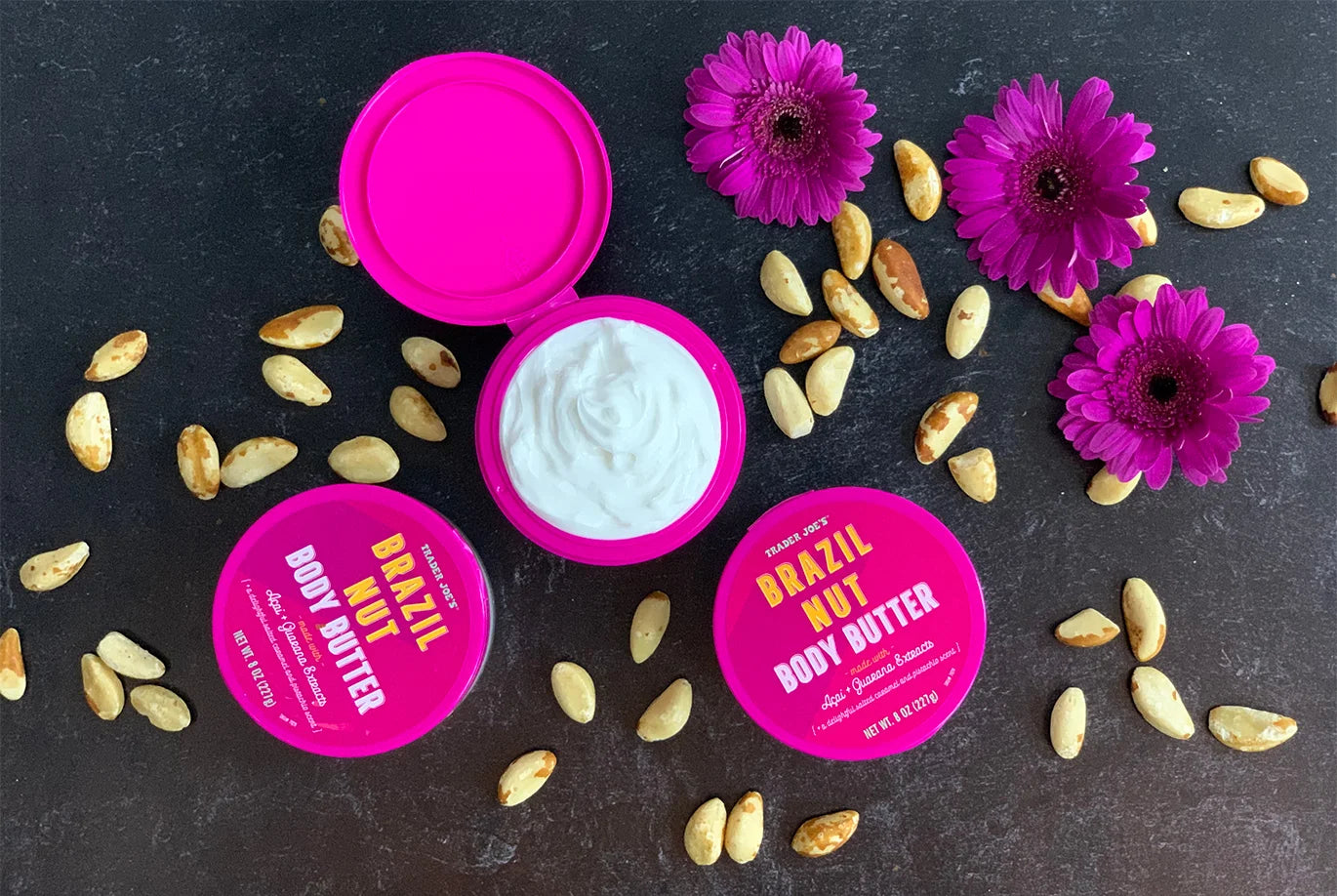 If there was ever a skin care product that deserved a melodic introduction, it’s Trader Joe’s Brazil Nut Body Butter! Yes, folks, your ideal summer skin-smoother is here! Thick, rich, and smelling of summer, this mega-moisturizer is crafted with an impressive list of ingredients, including coconut oil, shea butter, açai extract, guarana extract, and, of course, bertholletia excelsa seed oil—a.k.a. Brazil nut seed oil. Flip open the hot-pink lid to release the intoxicating scent of salted caramel, pistachio, and beachy notes of coconut and vanilla. Then, dip your fingers in to experience the unbelievably emolliant, almost whipped texture that says, “I am not just lotion; I am Butter for your Body.”